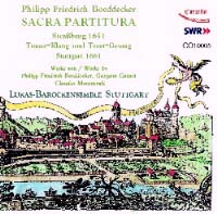 Anregungen. 1626-1629 war er in Buchsweiler (Elsaß) Organist und Gesangslehrer an der Lateinschule. Danach ging er als Fagottist und Organist an den Darmstädter Hof und gehörte anschließend der markgräflich-badischen Hofkapelle in Durlach an. Bereits 1633 wurde er als Organist an die Frankfurter Barfüßerkirche gewählt, einer damals sehr attraktiven Stelle, um die sich auch der Nürnberger Erasmus Kindermann beworben hatte. Dieses Amt konnte er aber wegen Verzögerung seiner Entlassung erst 1638 übernehmen. 1642 erhielt er einen Ruf als Organist an das Straßburger Münster und 1648 wurde er dort auch Universitätsorganist und Musikdirektor. 1652 trat er die Stelle des Stiftsorganisten in Stuttgart an, mit welcher auch die Inspektion der Stiftsmusik und die musikalische Unterweisung von Kapellknaben des Pädagogiums verbunden war. Traurige Berühmtheit erlangte in der Musikgeschichte der jahrelang andauernde Streit mit dem Hofkapellmeister Samuel Capricornus, in welchem sich die beiden Komponisten gegenseitig Fehler in ihren Werken vorwarfen. Philipp Friedrich Boeddecker starb 1683 in Stuttgart. Von seinen Werken ist nur wenig erhalten: Das 18-stimmige Te Deum, wohl zum Westfälischen Frieden (1648) komponiert und von Boeddecker "Melos irenicum" genannt (gedruckt 1650); die "Sacra Partitura" (1651) und "Trauer-Klang und Trost-Gesang" (1661), zwei Gelegenheitskompositionen. Eine, "...Handleitung zum Generalbaß" wurde 1701 von seinem Sohn Philipp Jakob Boeddecker herausgegeben. An verschollenen Werken werden genannt: ''Neuverstimbte Violenlust" für 3 Violen und b.c. (Frankfurt am Main 1652) und eine handschriftliche Sammlung 5-stimmiger Psalmen "contrapunctsweiß" (Stuttgart 1654). Die "Sacra Partitura" wurde 1651 in Straßburg gedruckt und Herzogin Sibylla von Württemberg gewidmet. Das einzige erhaltene Exemplar liegt in der Württ. Landesbibliothek Stuttgart. Sie umfaßt deutsche und 10 lateinische Solomotetten, darunter 3 von Gasparo Casati (+1641 in Novara) und eine von Claudio Monteverdi ("Ten. in Cant. Paßag. P.F.B."), nebst zwei hochvirtuosen Sonaten für Violine bzw. Fagott. Casatis Vaterunserkomposition "Pater noster" wurde von Boeddecker (für die lutherische Liturgie) mit einem Supplement versehen ("'Quia tuum est regnum ... - Denn dein ist das Reich ...). |